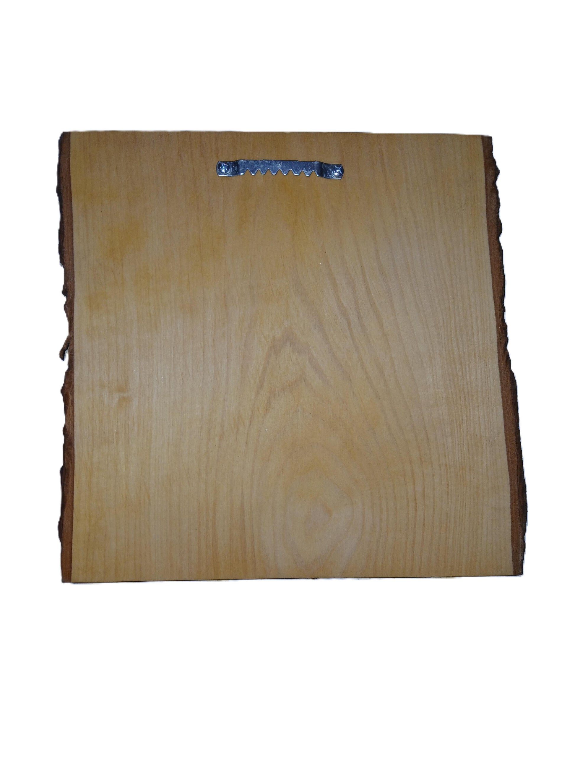 Live edge basswood has a barn and tractor burned in it. There is a sawtooth hanger on the back for hanging. Measures 9.75" wide and 9.5" tall.