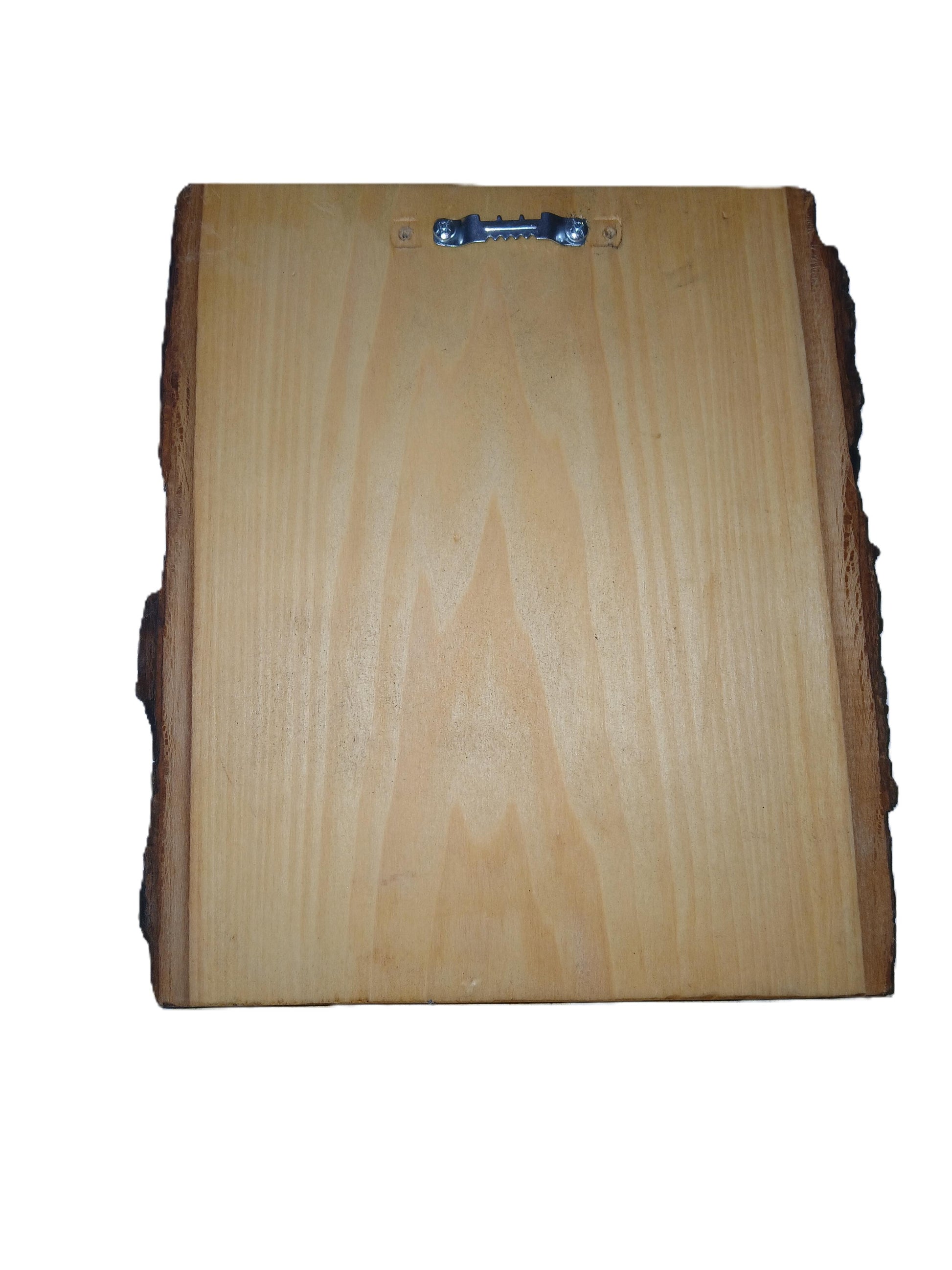 An image of a man fishing on a lake in the mountains burned into live edge basswood. A sawtooth hanger is on the back for hanging on the wall. Measures 8.25" wide and 9.25" tall.